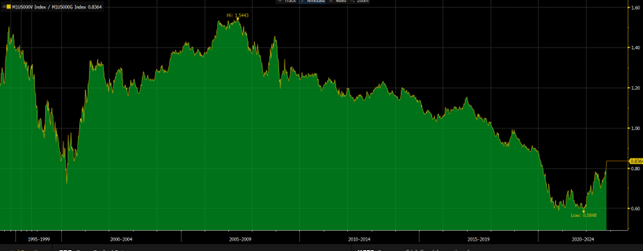 Nel complesso questa stagione dei risultati sembra ulteriormente confermare il trend in essere da inizio anno a favore di uno stile di gestione value. Come si può osservare nel grafico sottostante il rapporto tra l’indice MSCI US value ed MSCI US Growth, dopo aver raggiunto nel dicembre 2021 il minimo storico dagli anni Novanta, evidenzia un recupero significativo dello stile value, sebbene rimanga ancora molto terreno da recuperare per riavvicinarsi ai valori medi su base storica.