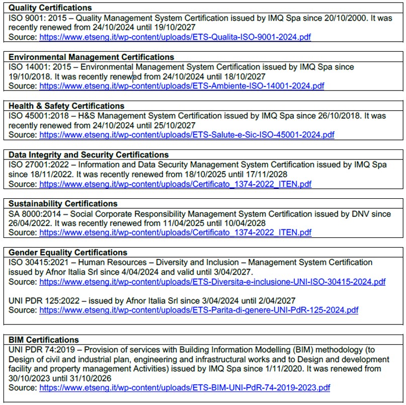 La società vanta un solido portafoglio di oltre 20 certificazioni specialistiche e 9 certificazioni aziendali, tra cui la ISO 9001 per la qualità, la ISO 14001 per la gestione ambientale e la certificazione SA 8000 per la responsabilità sociale. La società possiede le seguenti certificazioni: