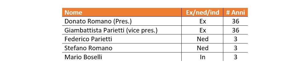 Il Consiglio di Amministrazione, nominato nel giugno 2025, vede Donato Romano nel ruolo di Presidente e Giambattista Parietti come Vicepresidente. Non vi è rappresentanza di genere all'interno del CDA ma è stato nominato un amministratore indipendente.