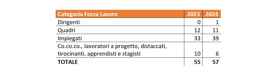 Il capitale umano rappresenta l'asset principale di ETS, che contava 57 dipendenti alla fine del 2024. La forza lavoro è altamente qualificata, composta per il 2% da dirigenti, il 19% da manager e il 68% da impiegati, tecnici e progettisti.
