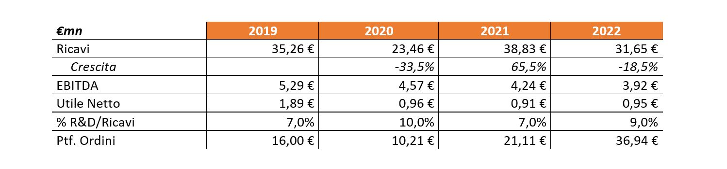 Il fatturato del 2022 risulta in flessione rispetto al 2021, ma il valore della produzione è invece in crescita (+30% YoY) grazie al portafoglio ordini consistente che richiede tempo per essere evaso e quindi trasformato in fatturato. Dal 2020 l’utile netto rimane pressoché stabile e l’incidenza delle spese di R&D sul fatturato aumenta al 9%.