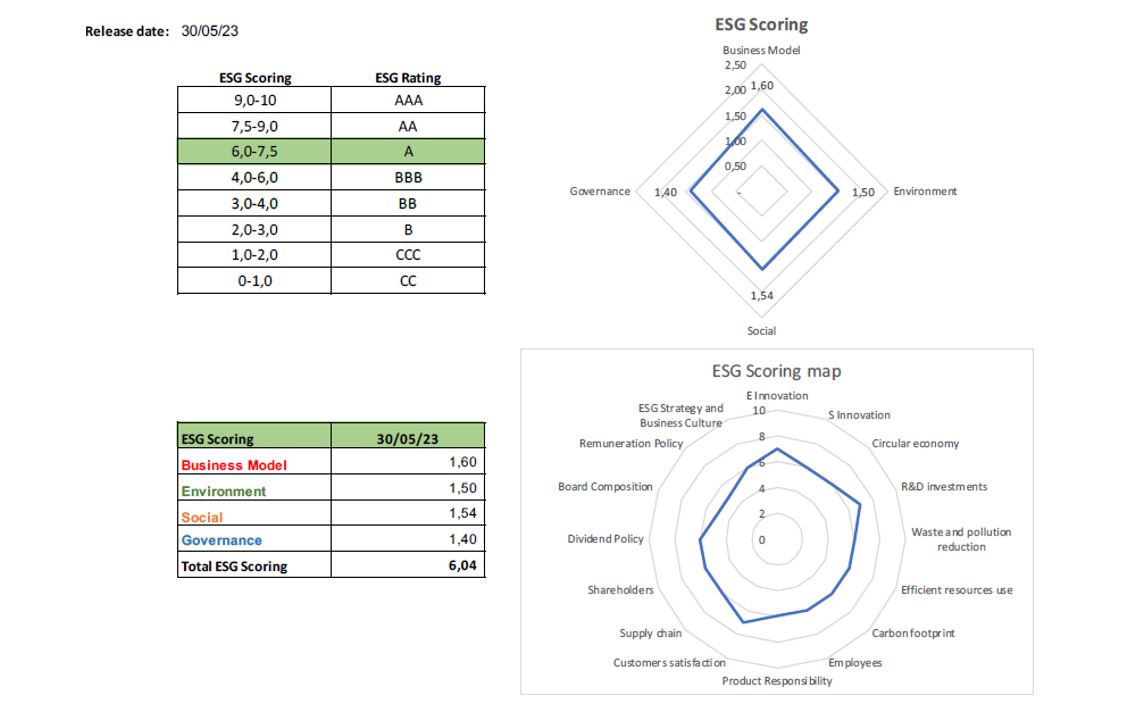 Di seguito presentiamo il punteggio e lo spaccato per voce del nostro score proprietario ESG. Ad oggi, Osai ha un rating A. Tramite i nostri interventi puntiamo a migliorare il rating della società e a renderlo maggiormente visibile alla comunità finanziaria.