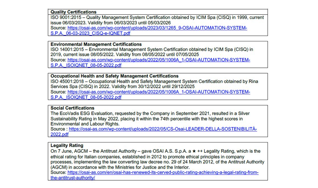 Strategia di Sostenibilità: Osai possiede lo stato di PMI Innovativa e nel 2023 ha ottenuto la qualifica di Benefit Company. La società ha una strategia di sostenibilità con degli obiettivi ESG definiti e misurati, spesso legati agli SDG delle Nazioni Unite. Inoltre, ha ottenuto il rating Silver di Ecovadis che evidenzia come principali punti di forza le dimensioni ambientali e il rispetto dei diritti dei lavoratori.